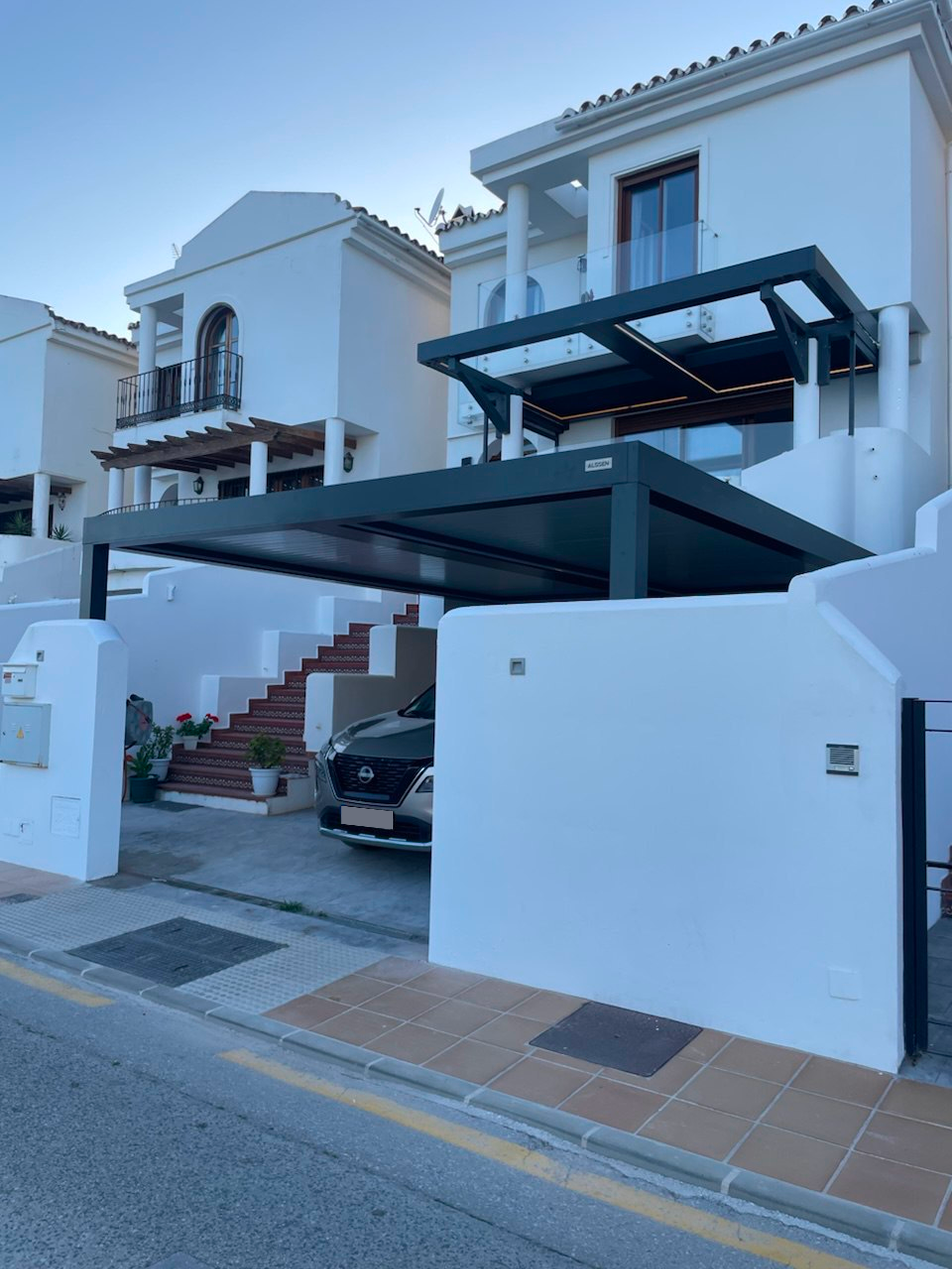 En este proyecto en Málaga, el objetivo era cubrir la zona de aparcamiento sin sobrecargar la fachada ni reducir el espacio de paso. La solución fue instalar una pérgola Apex Solid con panel sándwich, anclada a la vivienda para ofrecer máxima estabilidad con un diseño limpio y discreto.
