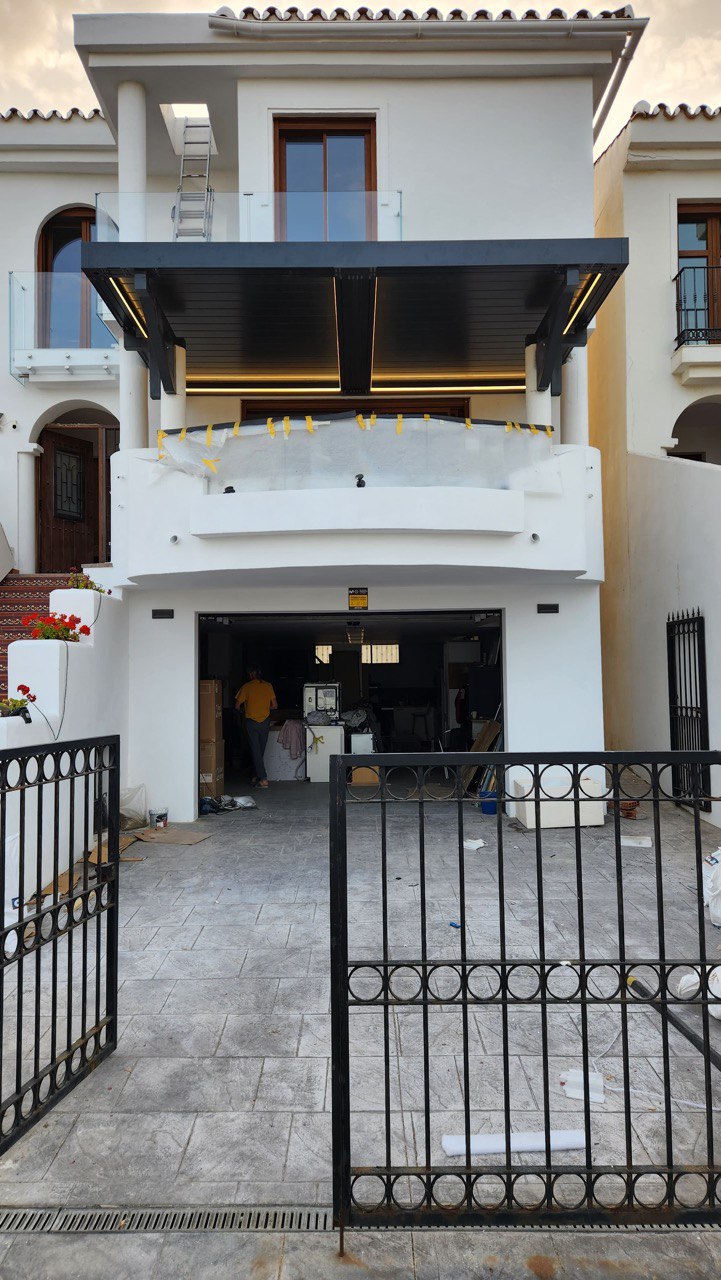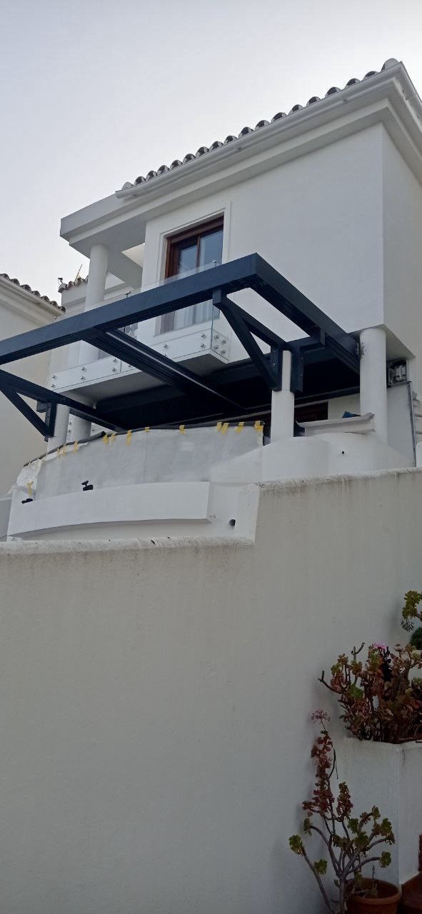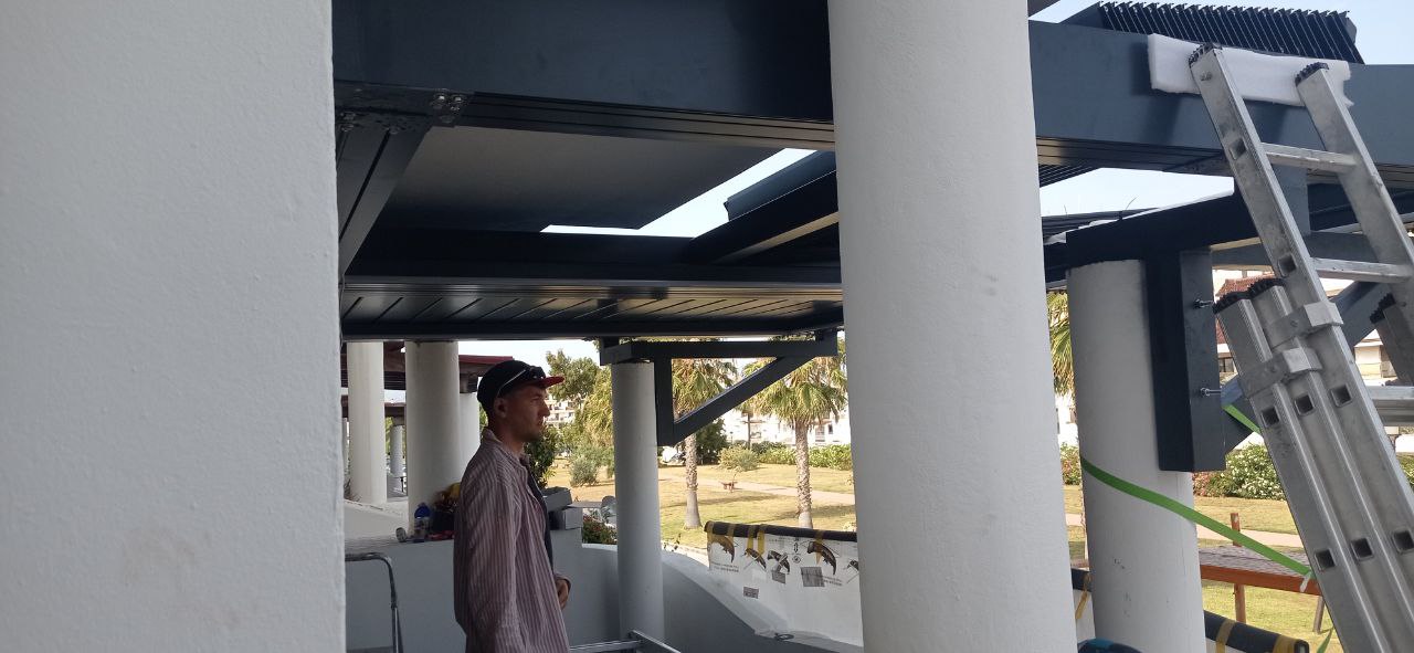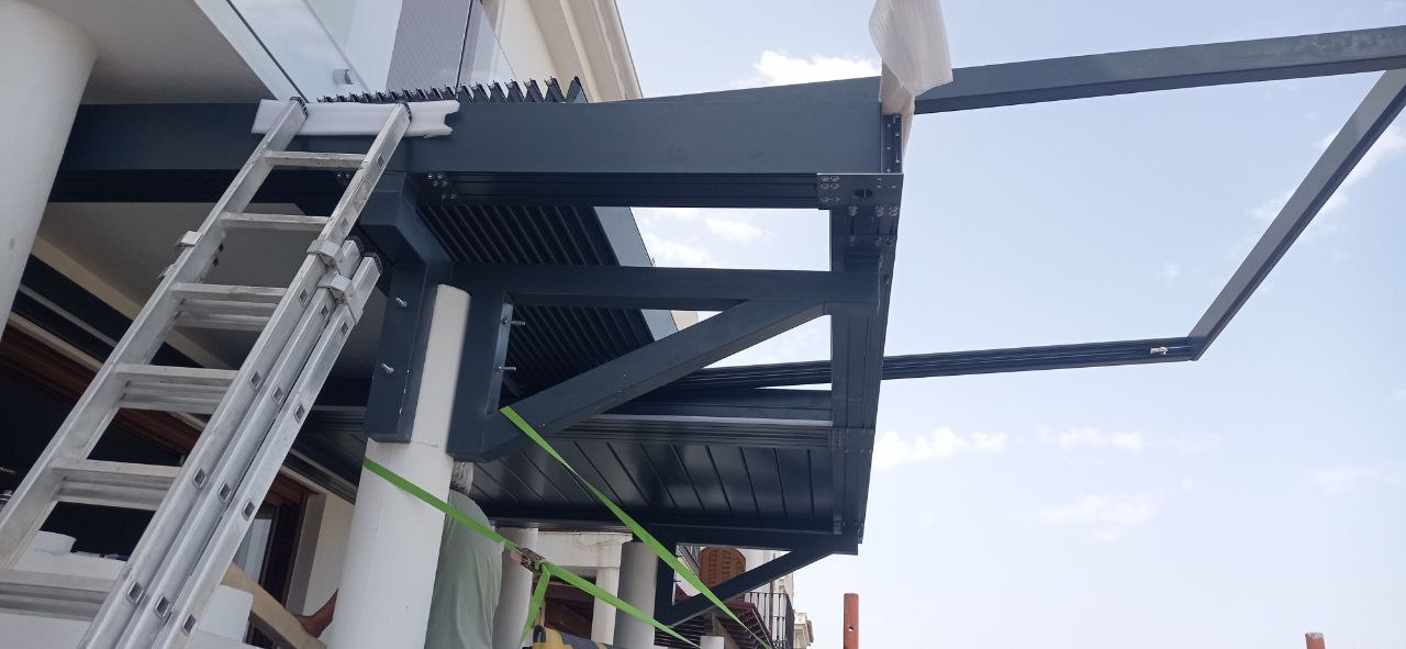 Para superar este reto, diseñamos y fabricamos estructuras metálicas especiales que permitieran fijar la pérgola entre los elementos existentes. Cada componente fue calculado y producido a medida, garantizando una instalación precisa, segura y visualmente armoniosa. Gracias a este trabajo minucioso, logramos una pérgola perfectamente integrada al entorno, que no solo respeta el diseño original del edificio, sino que también aporta funcionalidad.