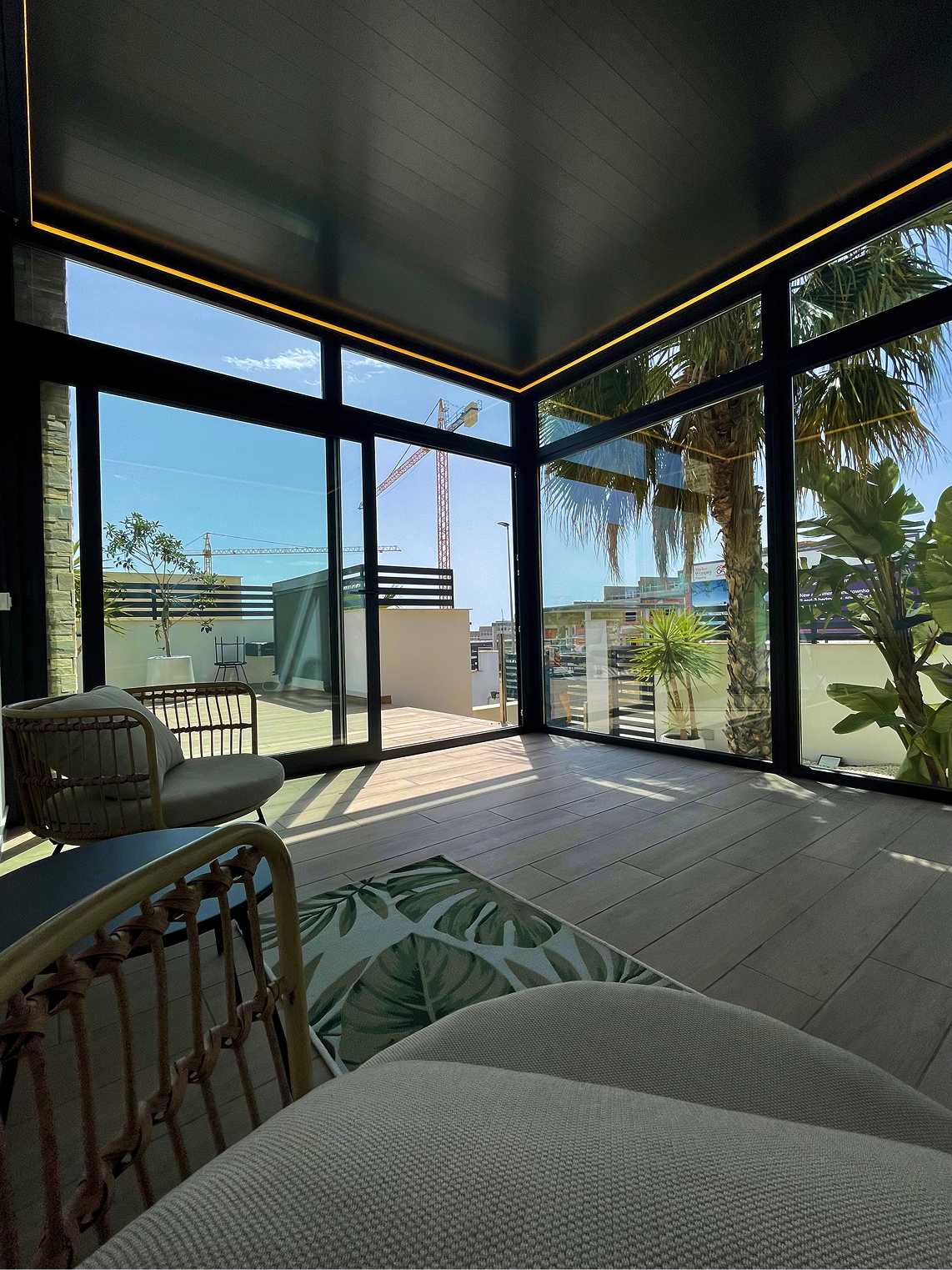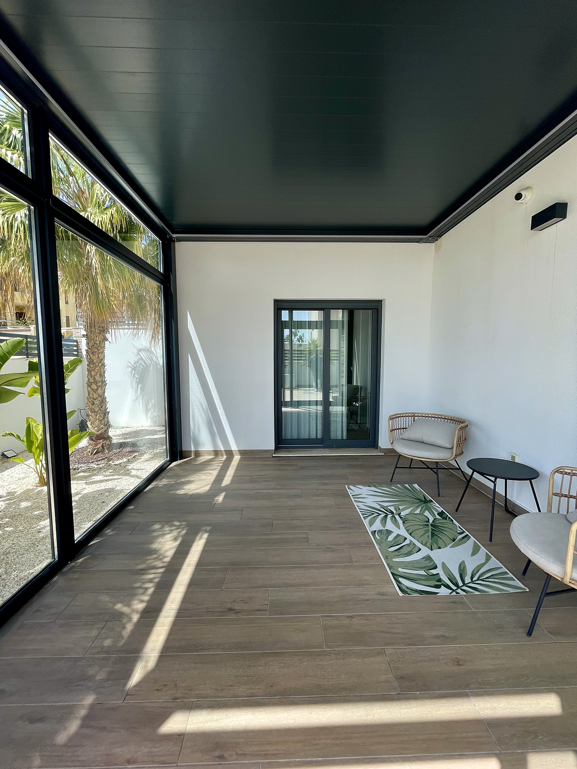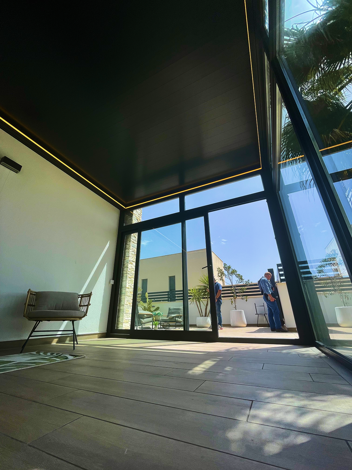 Decidimos instalar la pérgola Apex Solid, una solución resistente y moderna que aporta líneas limpias y un carácter arquitectónico definido. Para aprovechar al máximo la luz natural y garantizar el confort en cualquier época del año, instalamos un sistema de acristalamiento panorámico que permite disfrutar del entorno sin barreras visuales.
